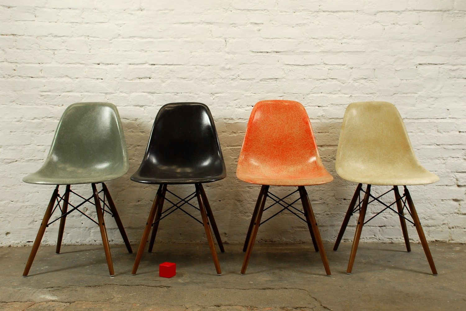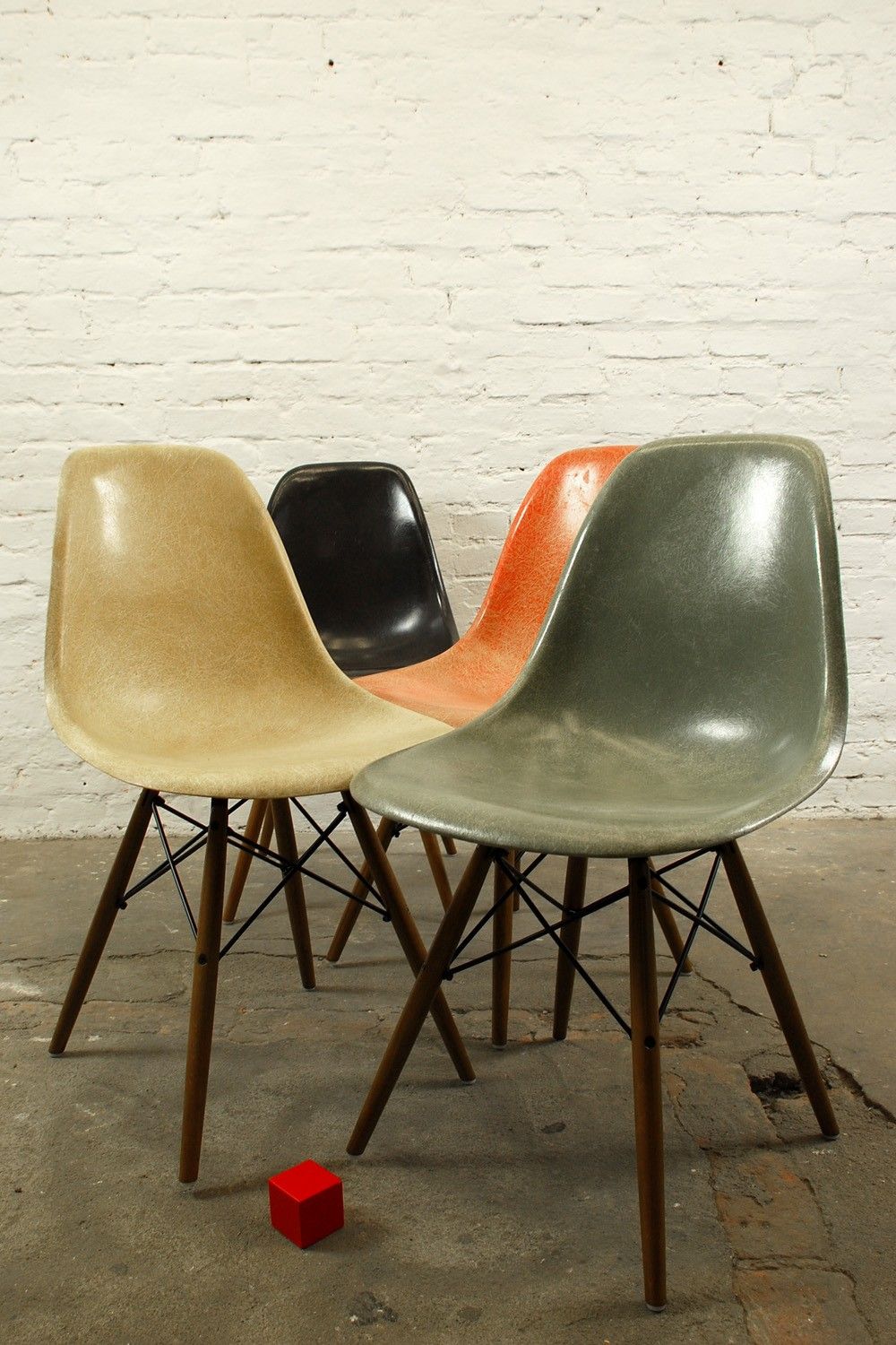 Beschreibung:Ein Satz sehr schöner Satz Herman Miller Side Chairs mit Dowel Bases in den Farben: salmon, seafoam-green, black und parchment. Tolle authentische Patina!