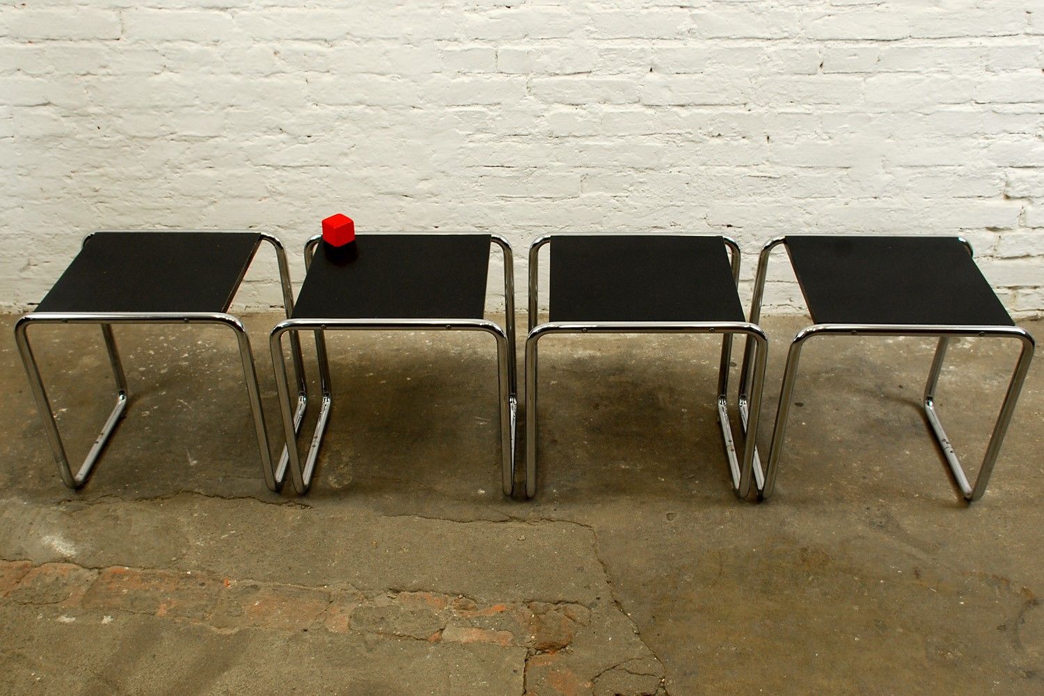 Es handelt sich um ein Stahlrohrhocker mit schwarzer Holzplatte.
