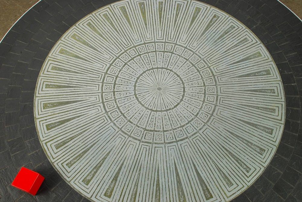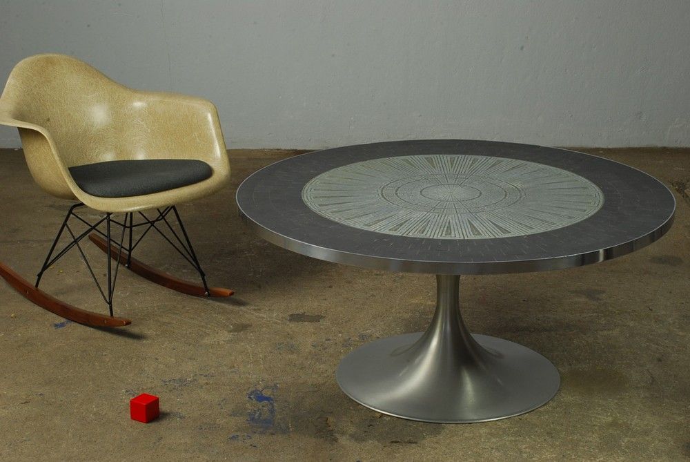 Seltener Couchtisch mit Tulpenfuß aus Aluminium, Deckplatte mit Schiefer und Aluminium belegt.