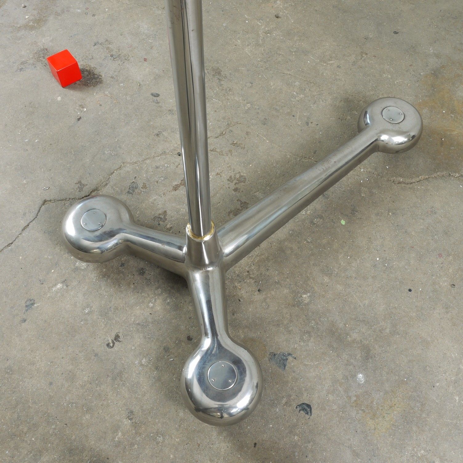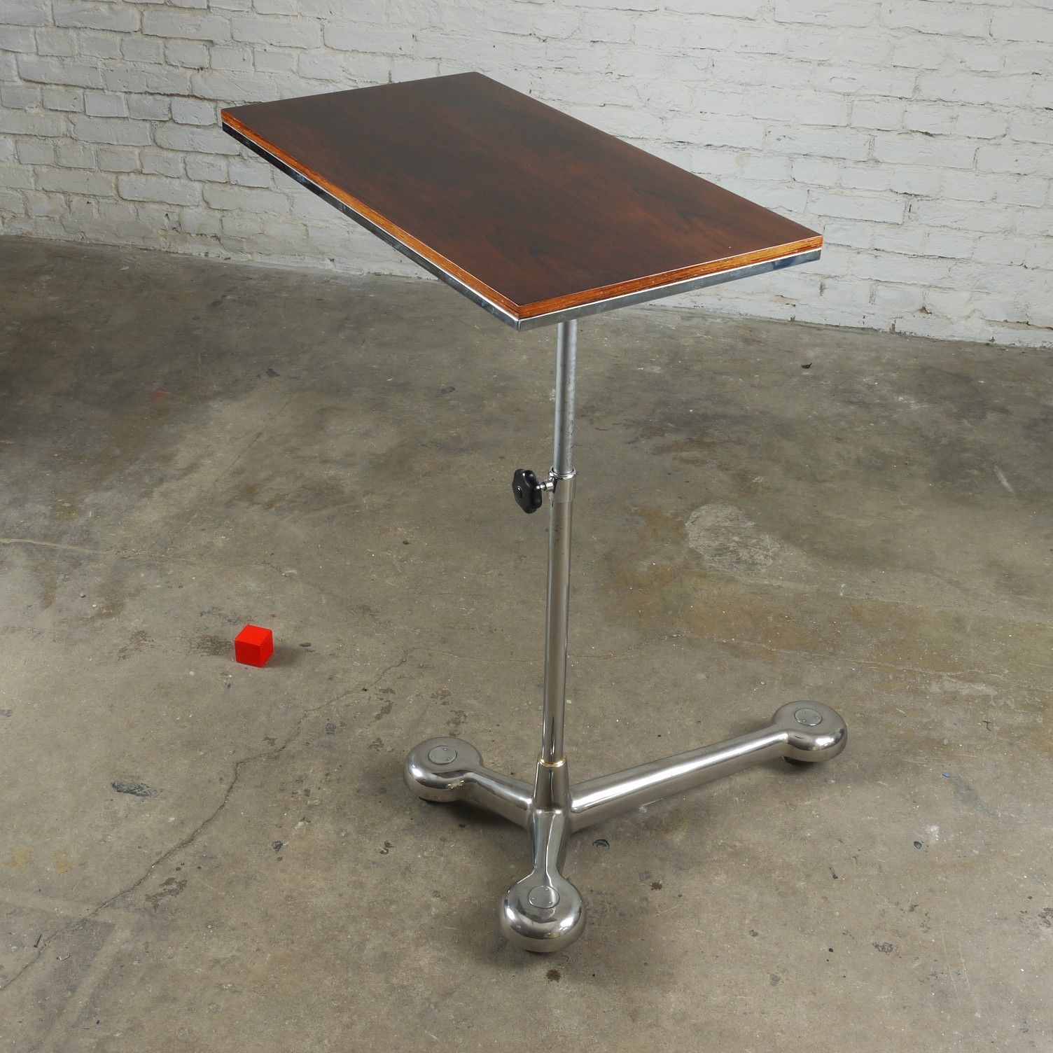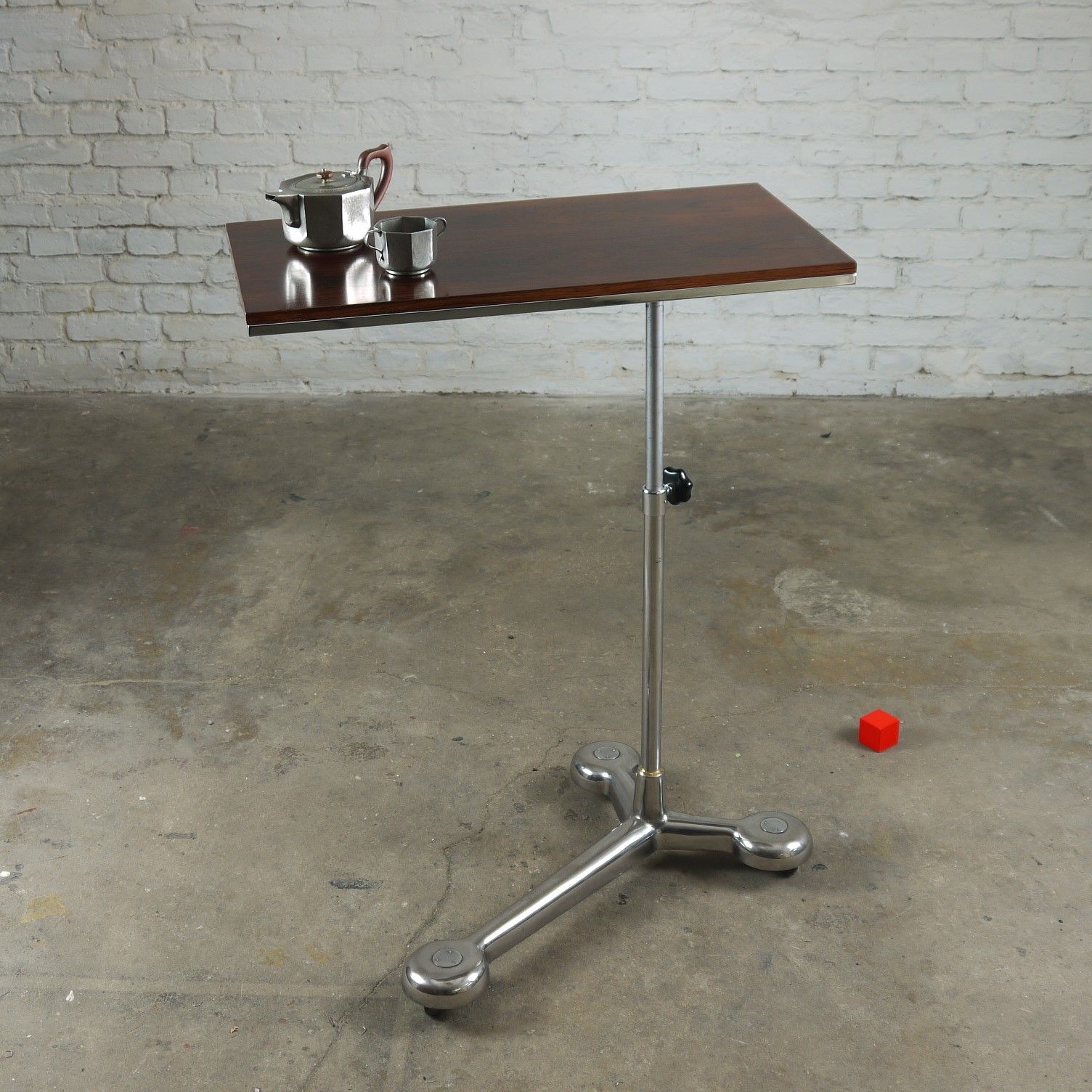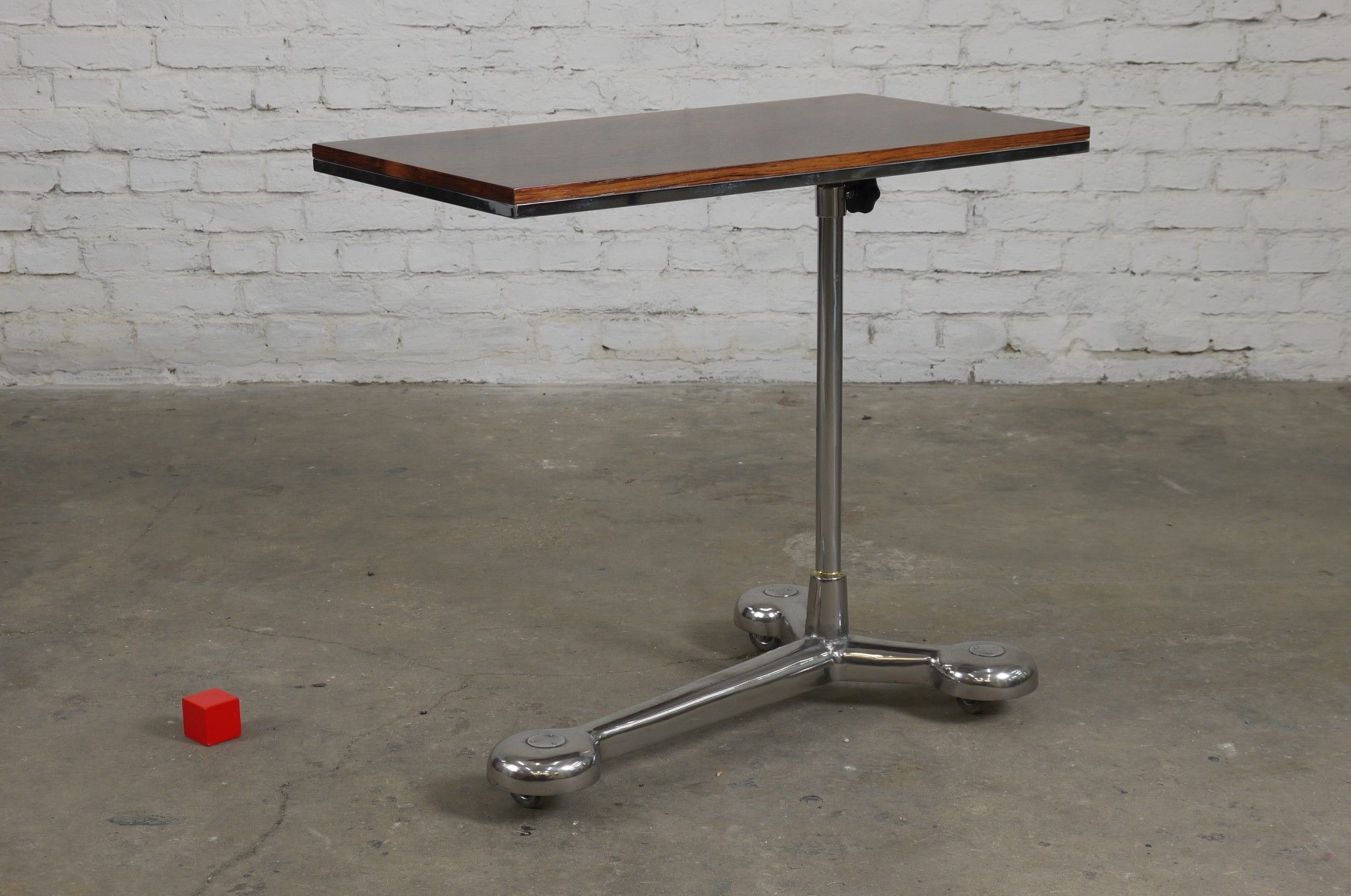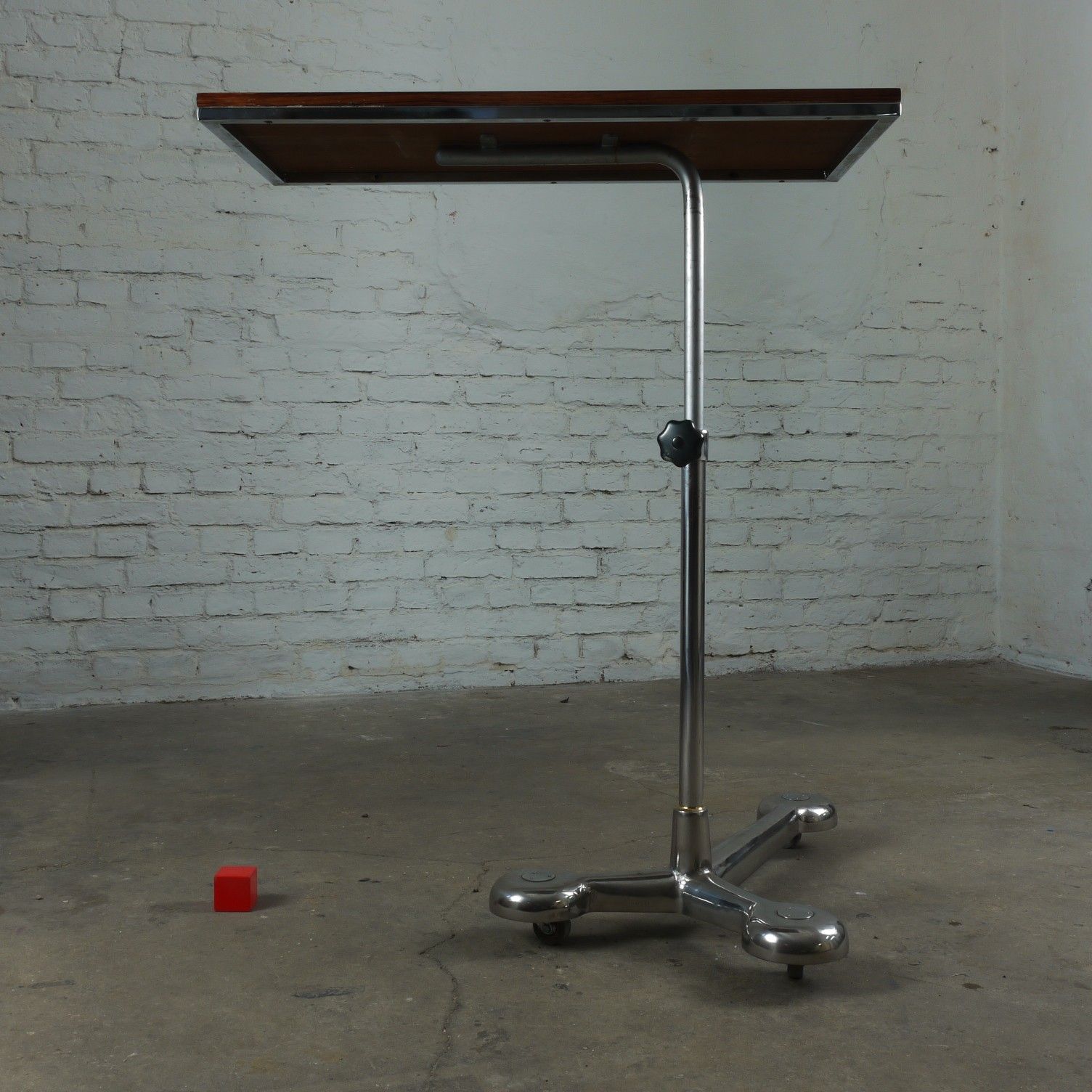 Er ist in der Höhe verstellbar und die Ablagefläche ist drehbar.