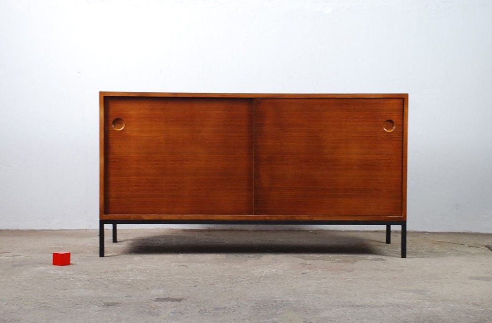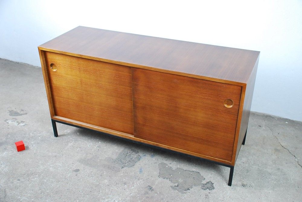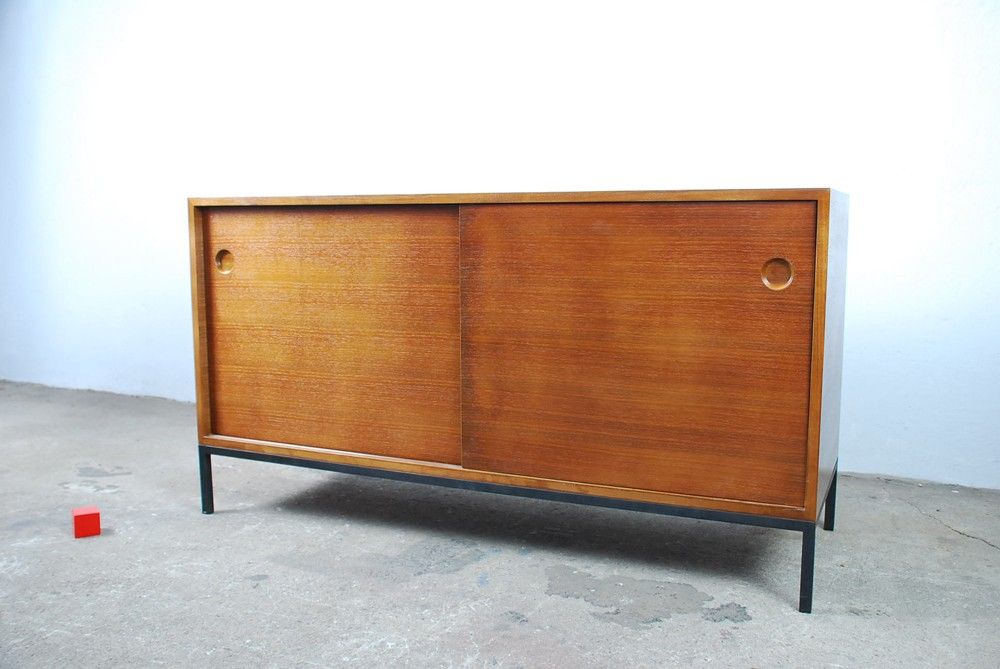 Sehr elegantes Sideboard mit Nussbaumfurnier und 2 Schiebetüren. Minimale altersgemäße Gebrauchsspuren sind vorhanden.