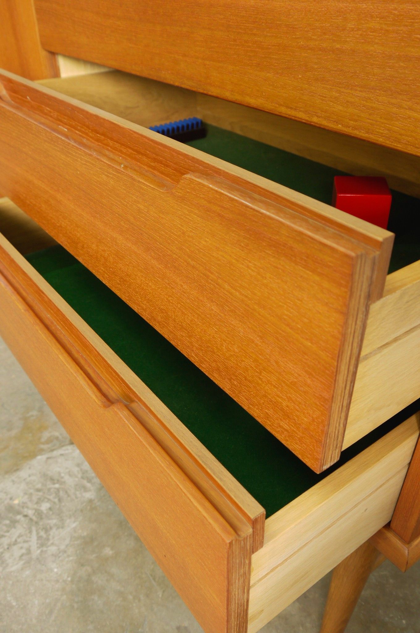 Es hat einen Einlegeboden und Schubladen.
