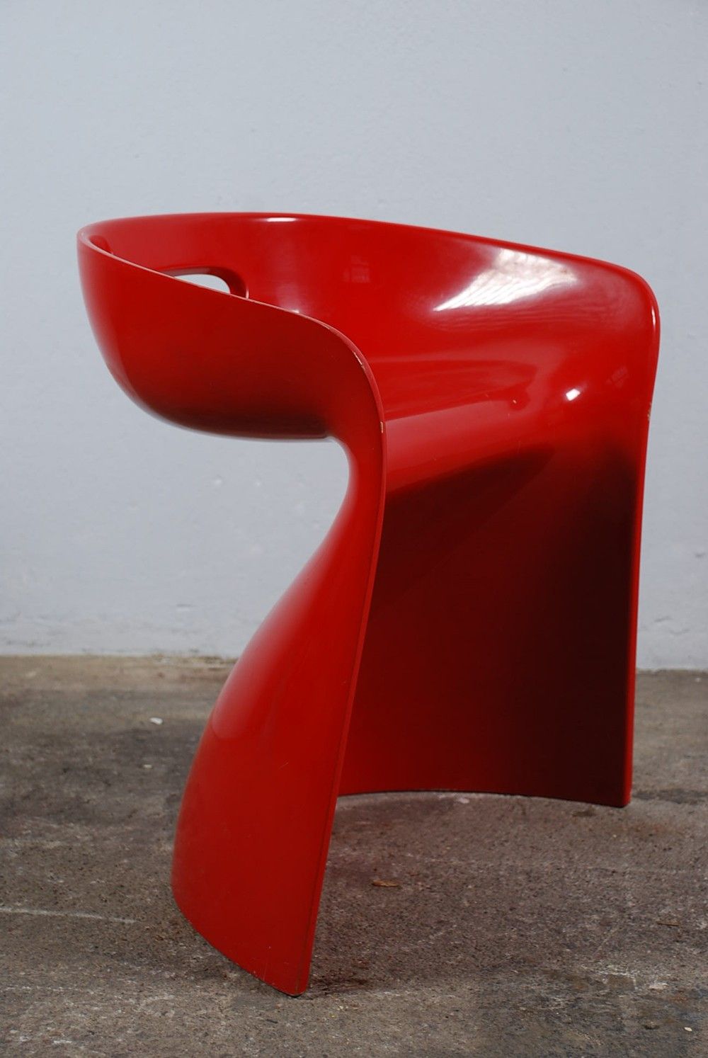 Seltener Hocker von Winfried Stäb aus Polyurethan. Besitzt ein Greifloch und leichte Rückenunterstützung. Lackiert in rot.