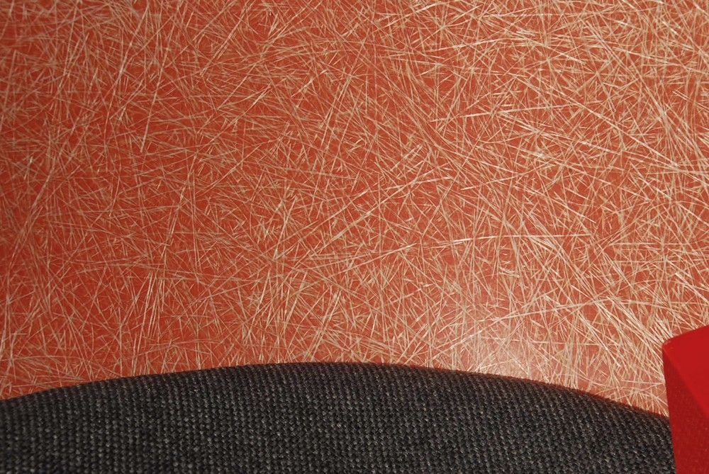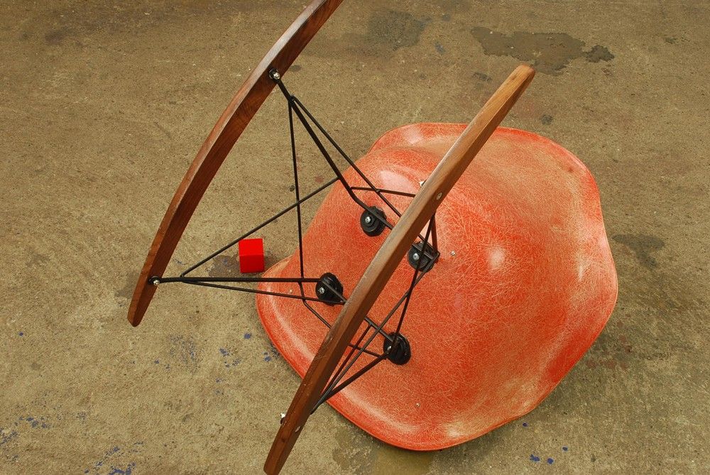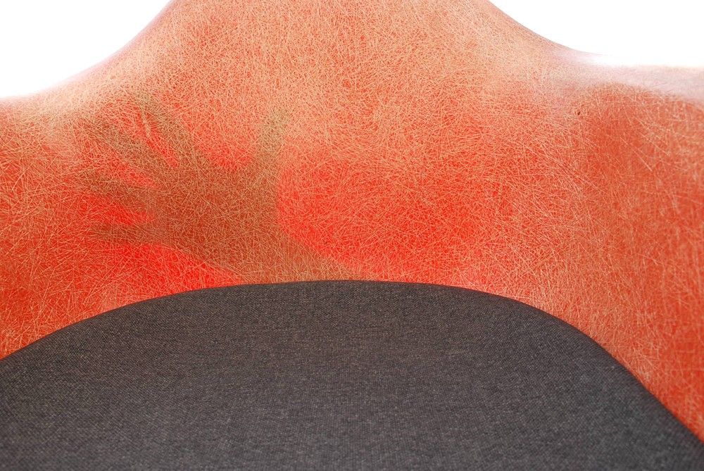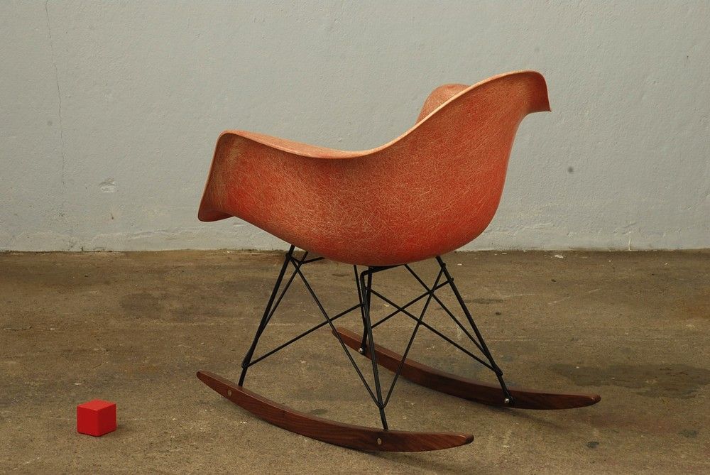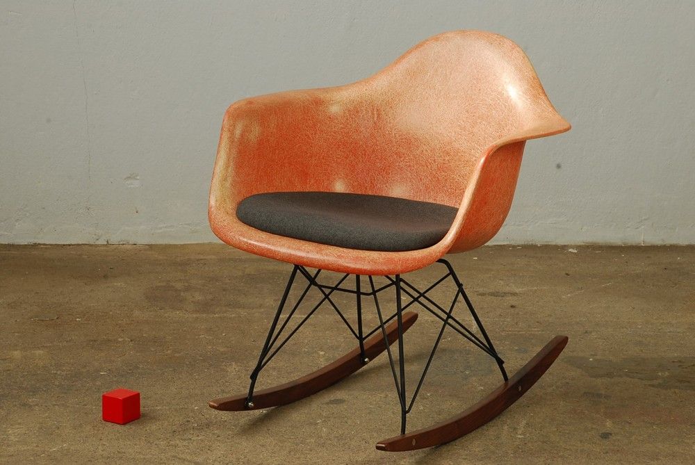 Very rare armchair on rocker base in salmon / orange color.The seatpad was furnished wit a hopsack in anthracite. The fibres are beautiful marked and translucent.